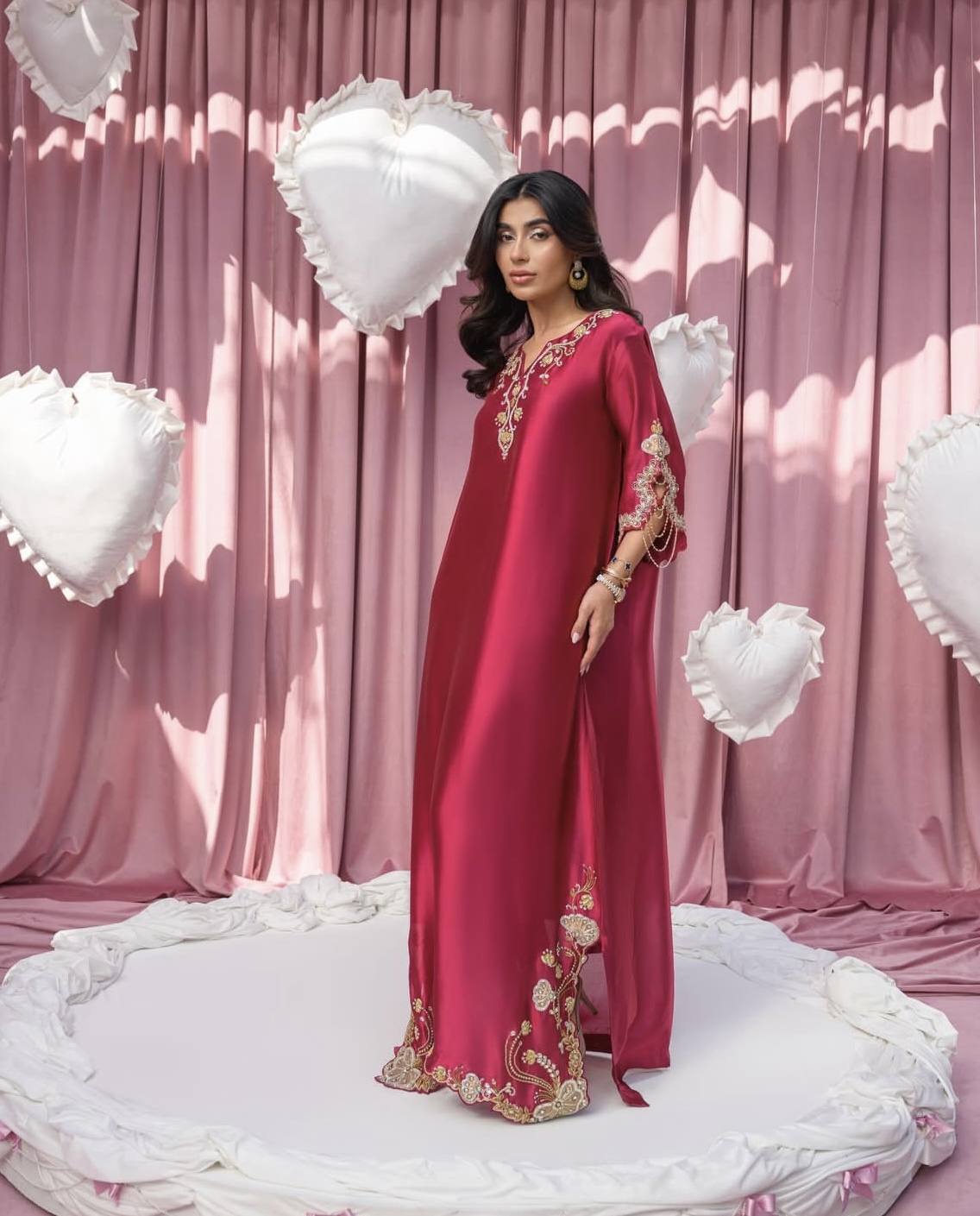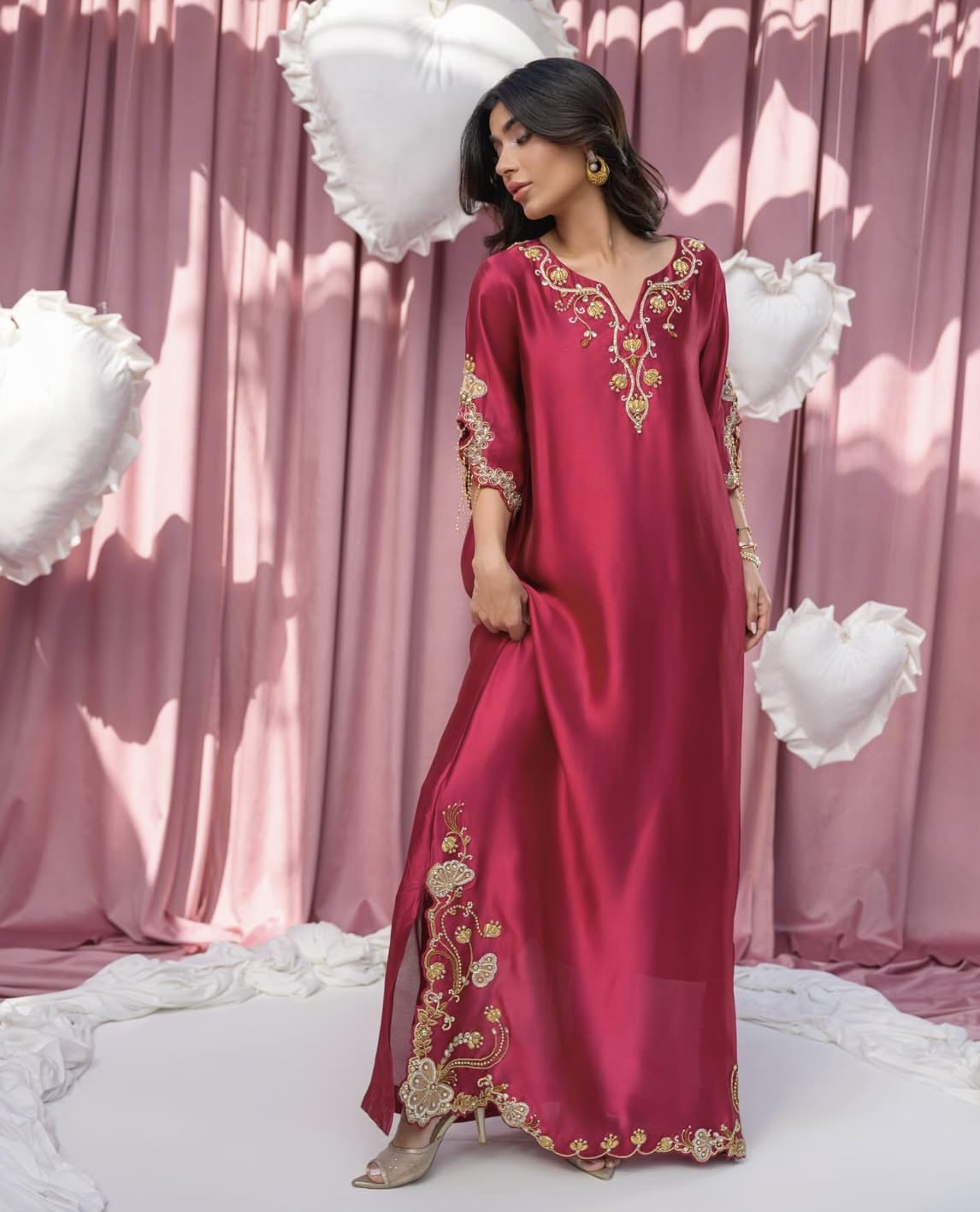Whats more beautiful than a crimson toned kaftan with gold sparkling details.